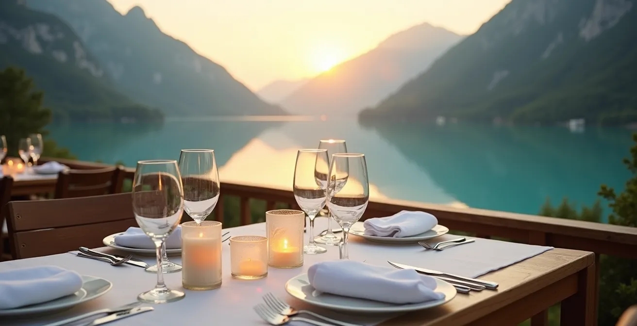 La transition du jour vers la nuit pendant le dîner ajoute une dimension narrative à l’expérience. Débuter le repas en pleine lumière puis le poursuivre sous l’éclairage tamisé, avec les premières étoiles apparaissant au-dessus du lac, crée une impression de voyage temporel. Cette métamorphose douce accompagne la progression culinaire sans rupture brutale.